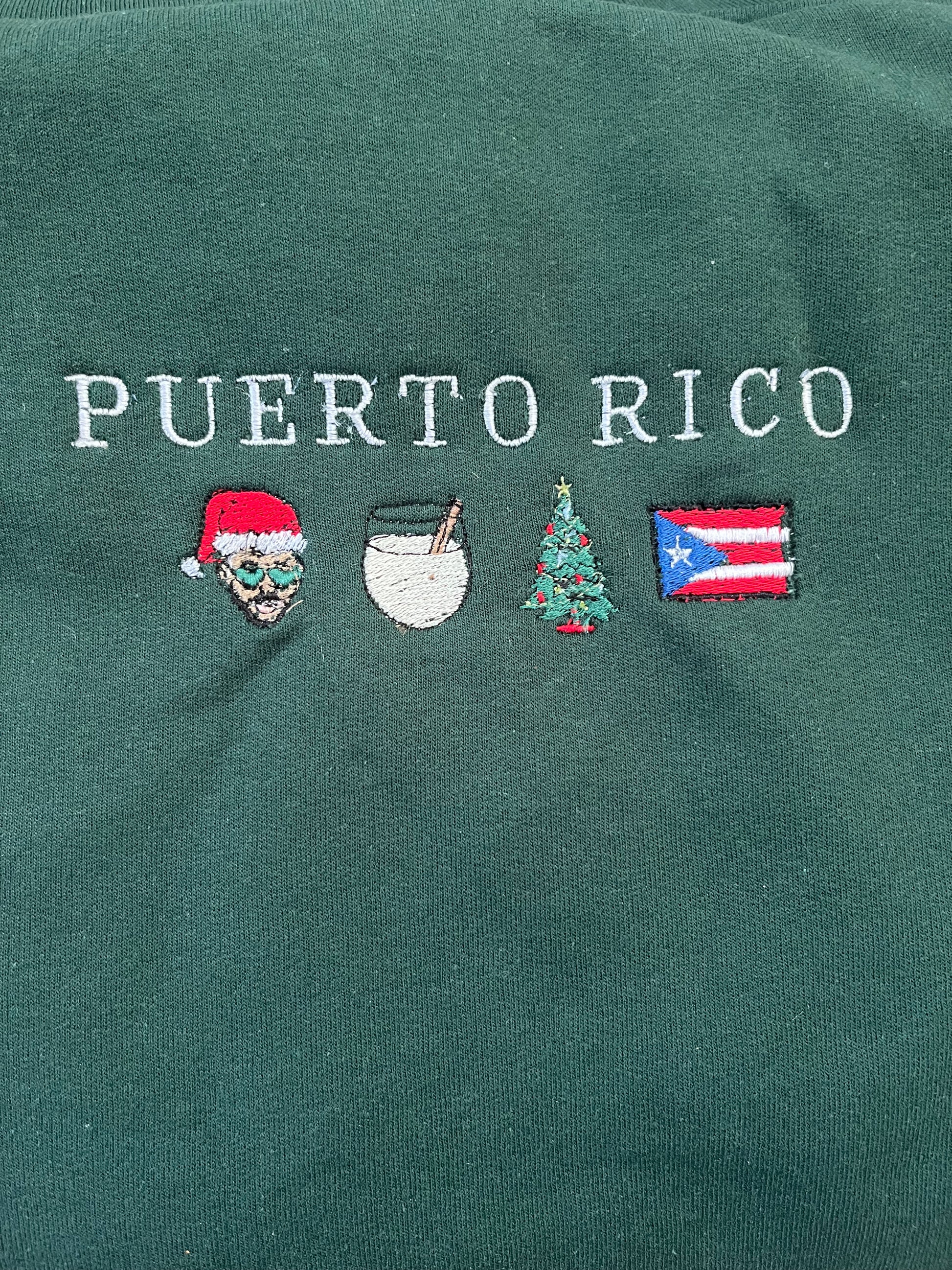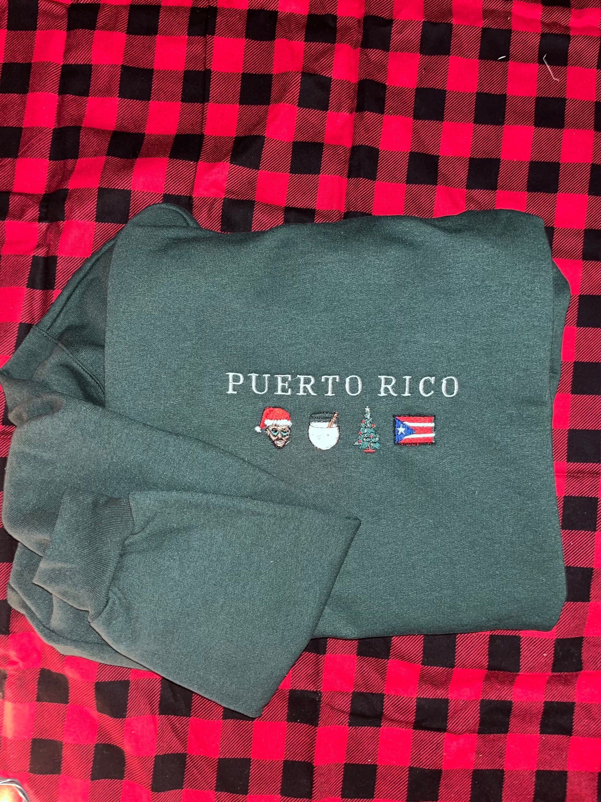 Crafted with comfort and style in mind, this crewneck sweatshirt features a bold, embroidered design that celebrates the iconic Puerto Rican culture, with a nod to the legendary Bad Bunny. The Puerto Rico flag, paired with elements of holiday cheer, makes it an eye-catching piece that represents both the island and the artist who has become a global sensation.